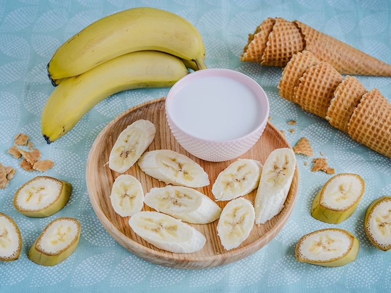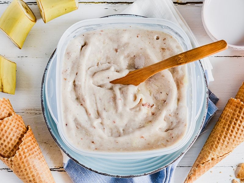Dojrzałe banany myjemy, obieramy ze skórki i kroimy w plasterki. Przekładamy do plastikowego naczynia i wkładamy do zamrażalnika na min 2 godz. Po wyjęciu, gdy są jeszcze dosyć miękkie, polewamy je mlekiem kokosowym i blendujemy na gładki krem. Ważne, aby banany były dojrzałe, wówczas nabiorą kremowej konsystencji i dodadzą deserowi słodkości. Za pomocą łyżki do lodów nakładadamy kulki do wafelków lub pucharków.