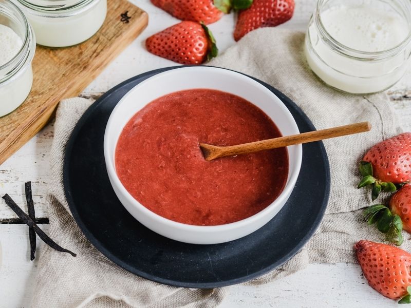 Połowę porcji truskawek blendujemy na gładki mus. Przed podaniem polewamy panna cottę musem truskawkowym i dekorujemy świeżymi truskawkami.