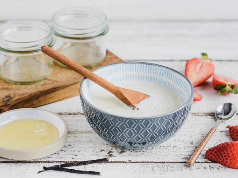 Mleko sojowe gotujemy na małym ogniu z agarem i syropem z agawy. Cały czas mieszamy. Po kilku minutach dodajemy mleko kokosowe. Przelewamy do słoiczków wysmarowanych olejem kokosowym. Odstawiamy na 30 min. do lodówki.