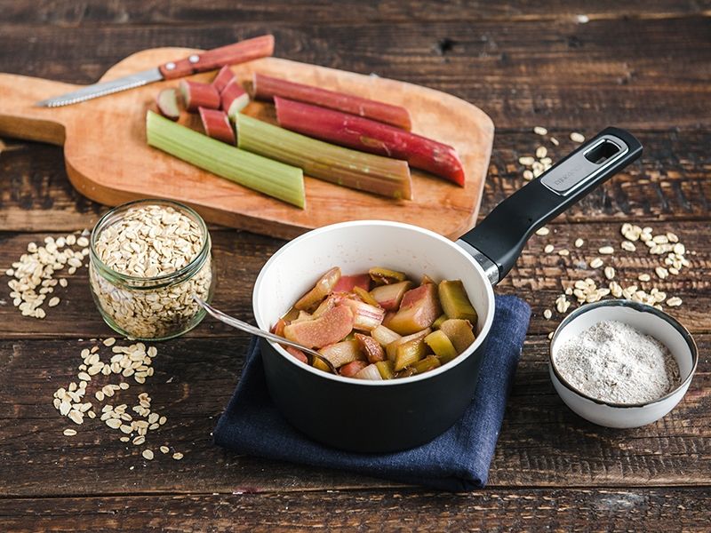 Pokrojony na centymetrowe kawałki rabarbar wrzucamy do garnka z masłem i cukrem. Całość dusimy na niewielkim ogniu ok 5-7 min. Następnie przekładamy do żaroodpornej brytfanki. Piekarnik nagrzewamy do 180 C.
