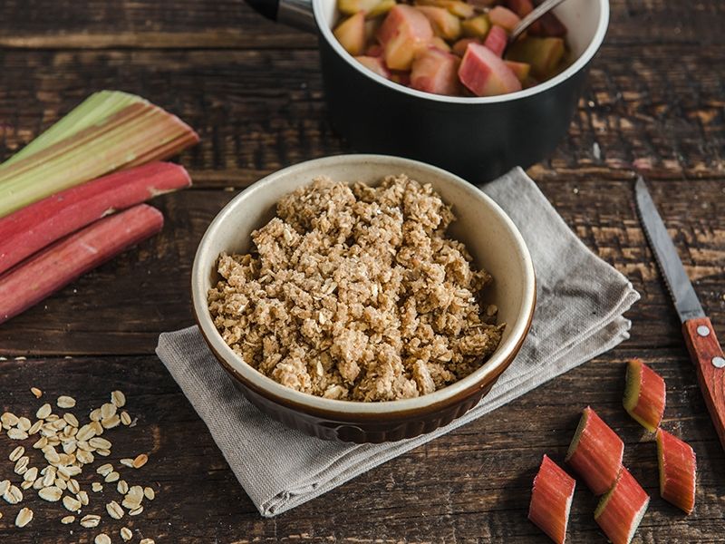 W osobnym naczyniu mieszamy mąkę z płatkami owsianymi (możemy je uprzednio zmiksować) oraz cynamonem. Dodajemy pokrojone w kostkę zimne masło oraz cukier. Całość rozcieramy z mąką na kruszonkę. Przesypujemy ją do brytfanki z rabarbarem, tak, aby pokryła lekko podduszone owoce. Wstawiamy do piekarnika i zapiekamy ok. 30 min. Podajemy z gałką lodów waniliowych