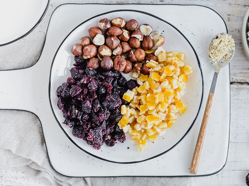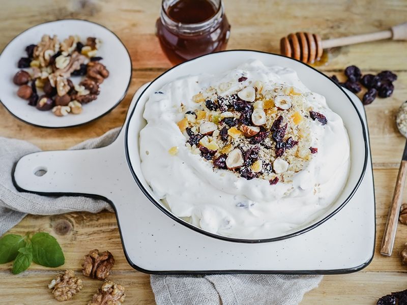 Schłodzoną śmietanę ubijamy na sztywno. Pod koniec dodajemy miód oraz jogurt naturalny i delikatnie mieszamy. Następnie orzechy włoskie blendujemy na drobną posypkę. Orzechy laskowe oraz żurawinę drobno kroimy i dodajemy do masy śmietanowej wraz z kandyzowaną skórką z pomarańczy oraz połową porcji posypki z orzechów włoskich. Wszystko dokładnie mieszamy i przelewamy do plastikowego pudełka.