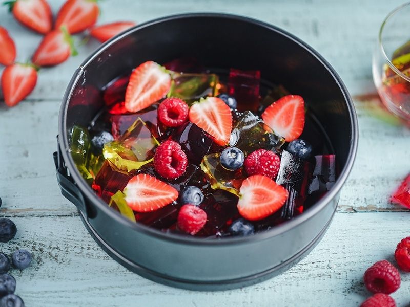 Po zastygnięciu wyciągamy galaretki z lodówki, kroimy w kosteczki i wkładamy do tortownicy o średnicy ok. 23 cm i ponownie wkładamy do lodówki. Możemy dorzucić kilka malin, borówek i truskawek.