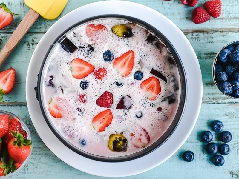 Zagotowujemy 250 ml wody, rozpuszczamy 2 galaretki truskawkowe ciągle mieszając. Gdy lekko przestygną, dodajemy 250 ml jogurtu naturalnego i blendujemy na gładką masę. Gdy zacznie tężeć wlewamy masę do tortownicy z kostkami różnokolorowych galaretek. Całość wkładamy do lodówki na 5-6 godz. lub całą noc. Torcik wyjmujemy z formy, dekorujemy borówkami, malinami oraz truskawkami.