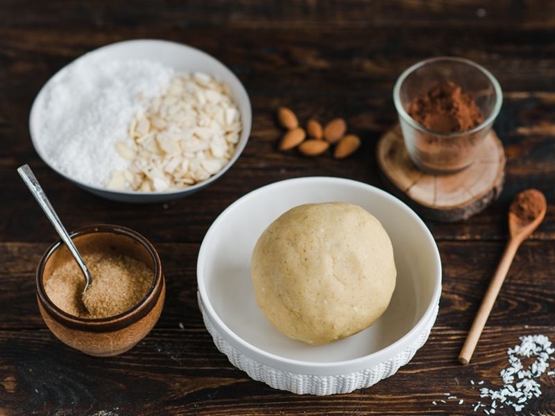 W misce zagnieść na gładkie ciasto mąkę, cukier, wiórki kokosa i posiekane w kostkę masło – dodając pod koniec jajko i wodę. Uformować kulkę, owinąć w folię spożywczą i włożyć do lodówki na 1 godz.