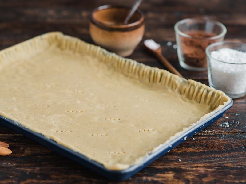 Nagrzać piekarnik do 180°C. Do formy włożyć rozwałkowane ciasto i nakłuć widelcem w kilku miejscach. Piec 20 min. na złoty kolor.
