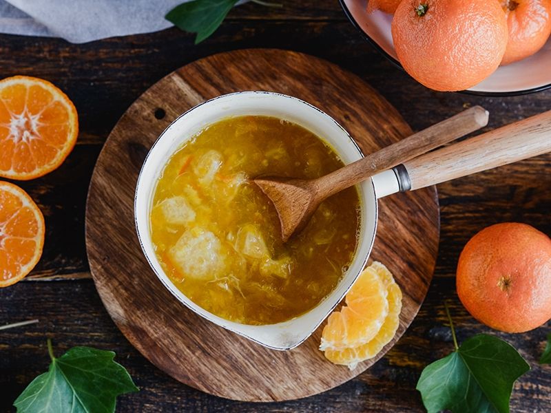 W międzyczasie mandarynki obieramy ze skórki i kroimy na mniejsze kawałki. Do rondelka przekładamy konfiturę, miód oraz mandarynki. Całość mieszamy i gotujemy ok. 2-3 min, aż powstanie gęsty syrop i zdejmujemy z ognia do wystudzenia.