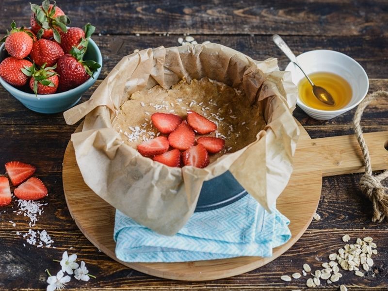 Piekarnik nagrzewamy do 180 C. Blaszkę do pieczenia wykładamy papierem do pieczenia. Następnie wykładamy na nią ciasto. Podpiekamy je w piekarniku ok 15 min. Następnie wyciągamy, układamy na wierzchu pokrojone truskawki. Ciasto posypujemy powstałą kruszonką. Wstawiamy do piekarnika na ok 35 min.