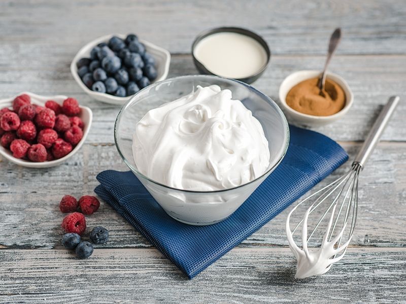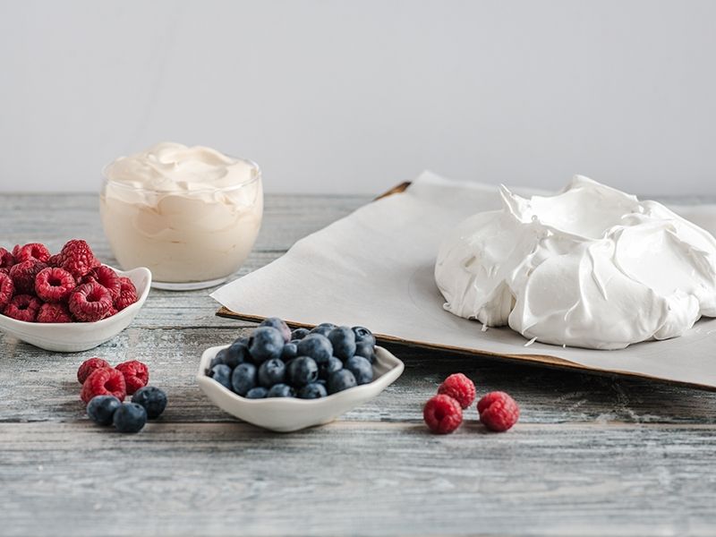 Na ostudzoną bezę wykładamy schłodzony krem, dekorujemy borówkami, malinami oraz posypujemy kakao.