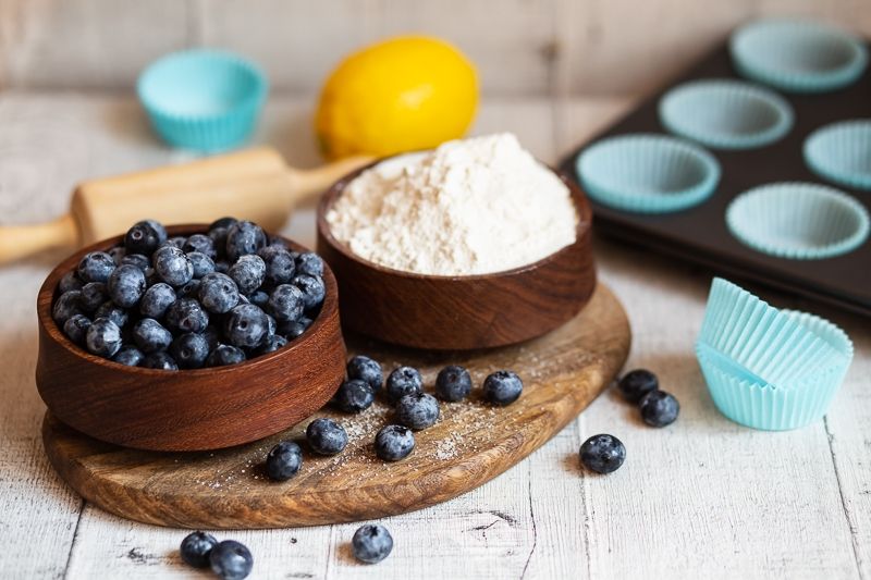 Masło umieszczamy w misie miksera razem z cukrem. Ubijamy przez ok. 5 min na puszystą masę, następnie dodajemy po jednym jajku, za każdym razem dokładnie mieszając. Dodajemy sok i skórkę z cytryny. Do masy przesiewamy mąkę z proszkiem do pieczenia. Całość dokładnie mieszamy do uzyskania jednolitej konsystencji i dodajemy borówki.