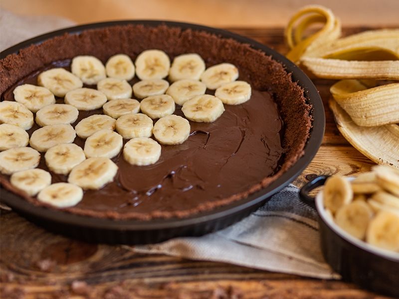 Na ciasteczkowy spód wykładamy masę czekoladową, potem banany i znów chłodzimy. Śmietankę ubijamy z cukrem pudrem i wykładamy na schłodzoną tartę przed samym podaniem. Ciasto można udekorować startą gorzką czekoladą.