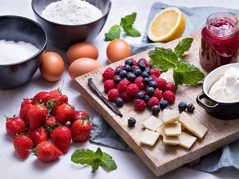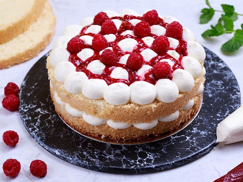 Biszkopt przekrajamy na 3-4 blaty. Każdy z nich nasączamy ostudzonym naparem z czarnej herbaty z cytryną. Szprycujemy krem na każdy blat i wykładamy konfiturę malinową oraz świeże maliny. Dekorujemy ulubionymi świeżymi owocami. Chłodzimy najlepiej całą noc w lodówce – tort jest najsmaczniejszy na drugi dzień!