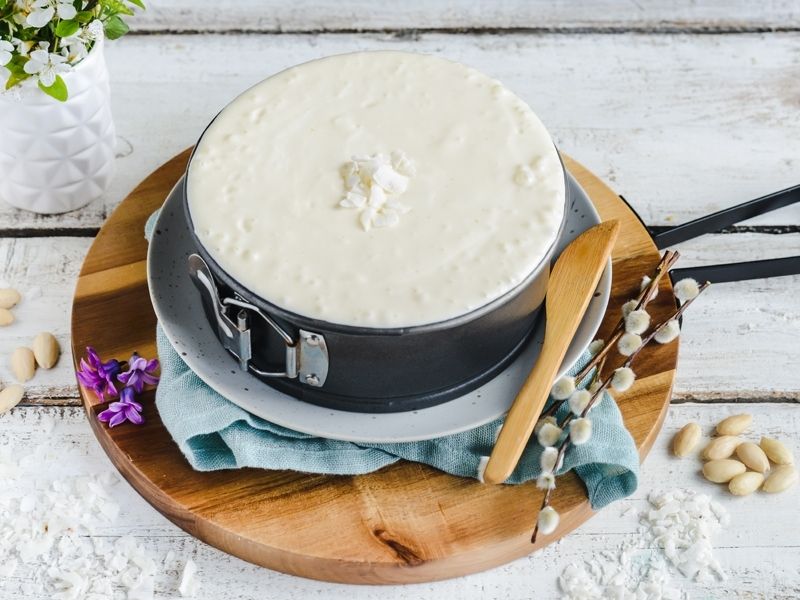 Piekarnik nagrzewamy do 170 C. Do naczynia przekładamy zmielony twaróg. Dodajemy serek mascarpone i miksujemy na jednolitą masę. Dodajemy mąkę ziemniaczaną i cukier, a po chwili jajka. Miksujemy do uzyskania jednolitej konsystencji. Na końcu dodajemy gęste mleko kokosowe (z górnej części puszki) lub śmietankę kokosową.