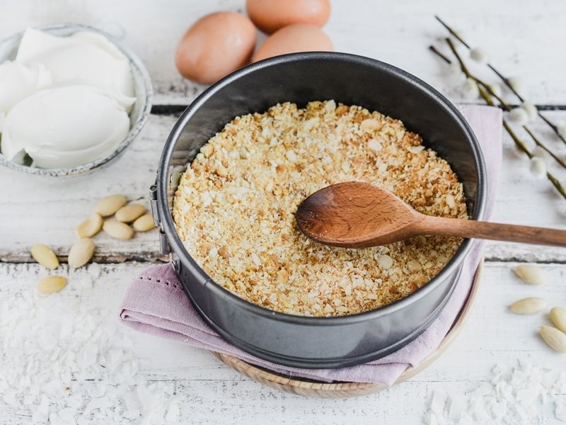 Ciasteczka przekładamy do blendera i miksujemy. Dodajemy mielone migdały, wiórki kokosa oraz roztopione masło. Całość mieszamy, przekładamy na dno tortownicy wyłożonej papierem do pieczenia i umieszczamy w lodówce.