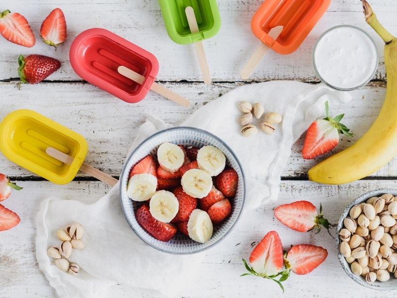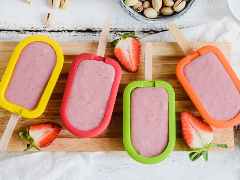 Truskawki miksujemy z bananem na gładki mus. Dodajemy mleczko kokosowe i dalej miksujemy. Przelewamy masę do foremek i wkładamy do zamrażalnika na 1-2 godz. W międzyczasie obieramy i lekko kruszymy pistacje. Olej kokosowy łączymy z mleczkiem kokosowym i syropem z agawy. Po upływie 1 godz. posypujemy lody pistacjami i polewamy kokosową polewą.