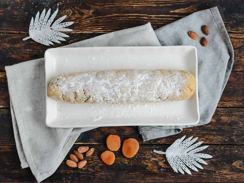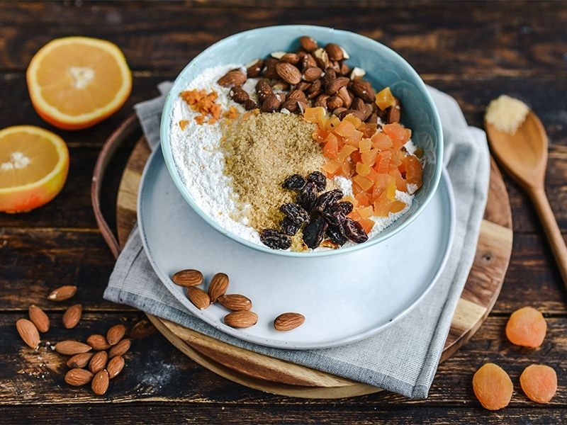 Do miski przesiewamy mąkę. Dodajemy proszek do pieczenia, skórkę z pomarańczy, migdały, morele, żurawinę. Wbijamy jajka i wlewamy sok z pomarańczy. Mieszamy do połączenia się składników. Następnie formujemy ciasto w podłużny chlebek. Układamy go na blaszce oprószonej mąką i pieczemy w temperaturze 175ºC przez 25 min., aż będzie złotobrązowy. Wyciągamy ciasto i studzimy.
