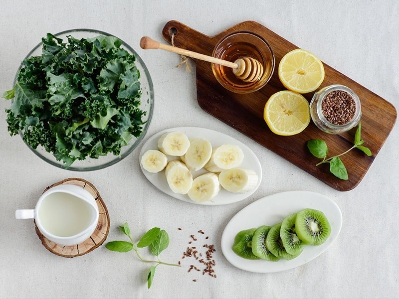 Jarmuż myjemy, odrywamy twarde końce i wrzucamy do blendera. Dodajemy pokrojonego banana, obrane kiwi, mleko sojowe, sok z cytryny oraz łyżkę miodu.