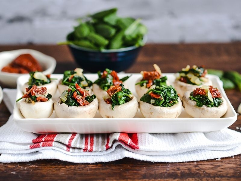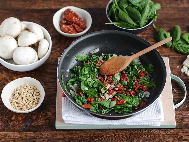 Pieczarki myjemy i odcinamy im nóżki. Cebulę i czosnek kroimy w kosteczkę i podsmażamy na łyżce oliwy do zarumienienia. Po chwili dodajemy pokrojone na kawałki suszone pomidory oraz szpinak. Doprawiamy solą, pieprzem i gałką muszkatołową. Dusimy 4-5 min., aż szpinak zmięknie i zmniejszy objętość.