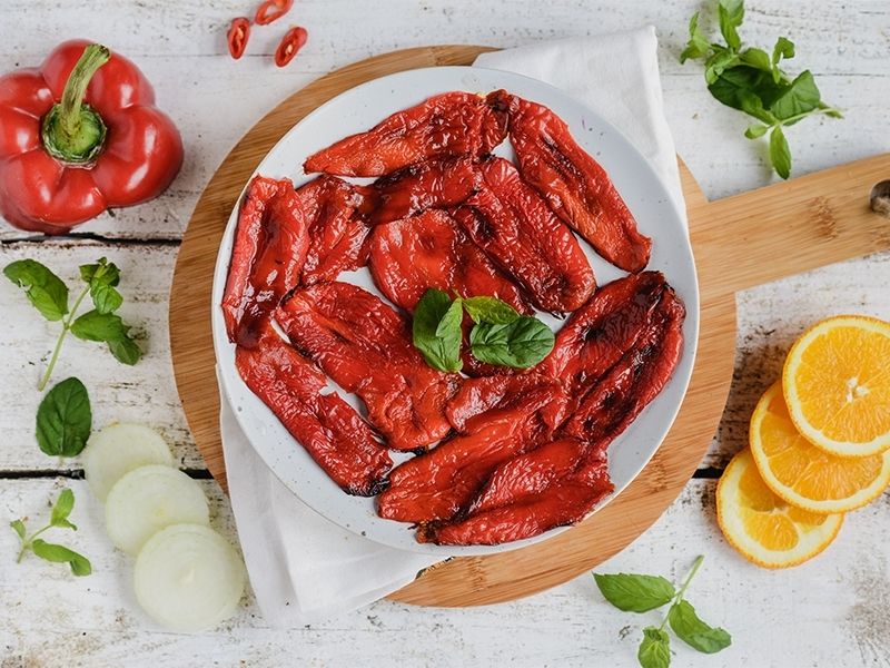 Piekarnik nagrzewamy do 180 C. Papryki myjemy, kroimy na mniejsze kawałki i układamy na blaszce wyłożonej papierem do pieczenia. Wkładamy do piekarnika na 35 min. W połowie czasu pieczenia przewracamy paprykę na drugą stronę. Wyjmujemy ją, kiedy skórka zacznie przypiekać się na czarno. Przekładamy paprykę na talerz i przykrywamy folią aluminiową na 30 min. Następnie zdejmujemy skórkę.