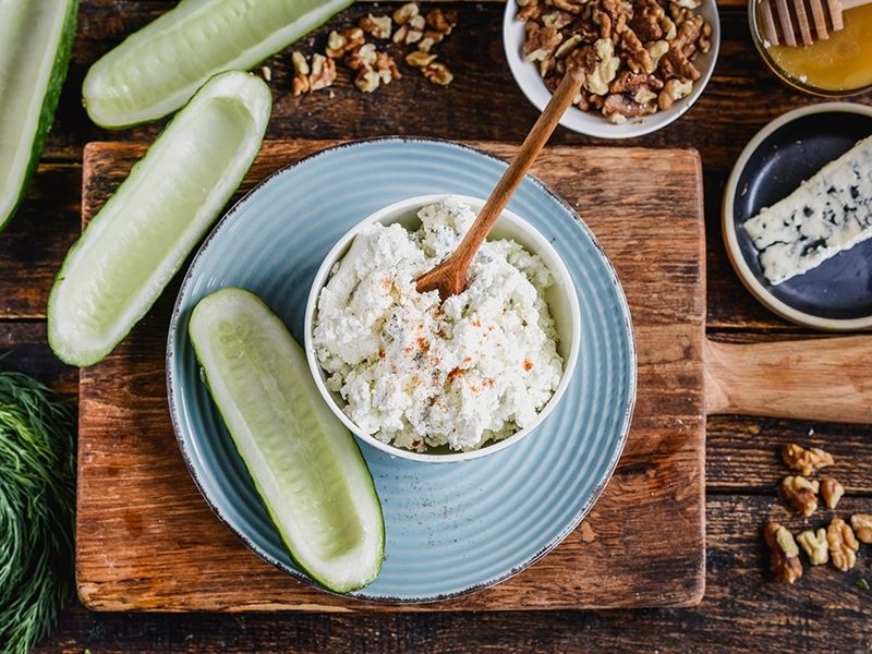 Ogórki myjemy, przekrawamy na pół i wydrążamy środek. W osobnej misce mieszamy ser twarogowy z gorgonzolą. Dodajemy łyżkę jogurtu naturalnego. Doprawiamy posiekanym koperkiem, solą oraz pieprzem.