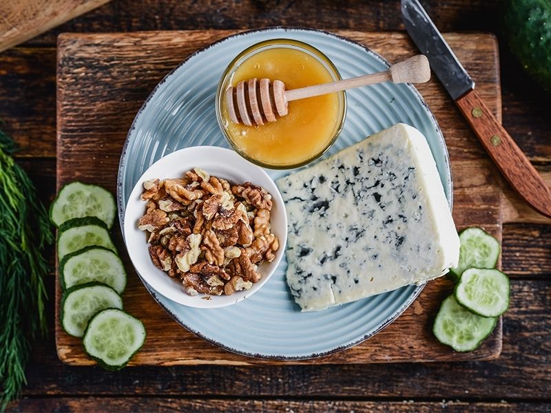Powstałym farszem nadziewamy ogórkowe łódeczki. Posypujemy je orzechami włoskimi. Oliwę mieszamy z miodem i cytryną. Powstałym sosem polewamy łódeczki przed podaniem.