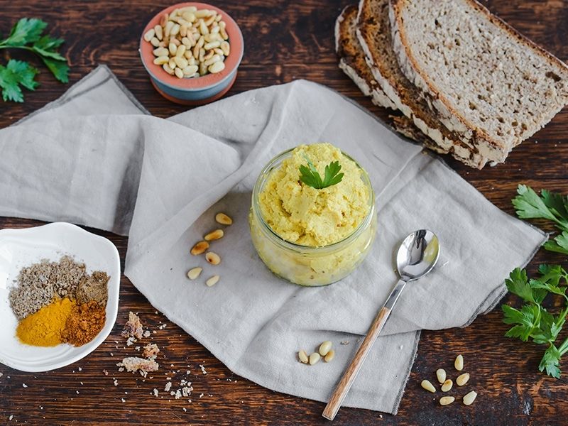 Gotową pastą smarujemy kromki pełnoziarnistego pieczywa. Każdą kromkę posypujemy prażonymi orzeszkami pinii oraz posiekaną pietruszką i polewamy oliwą z oliwek.