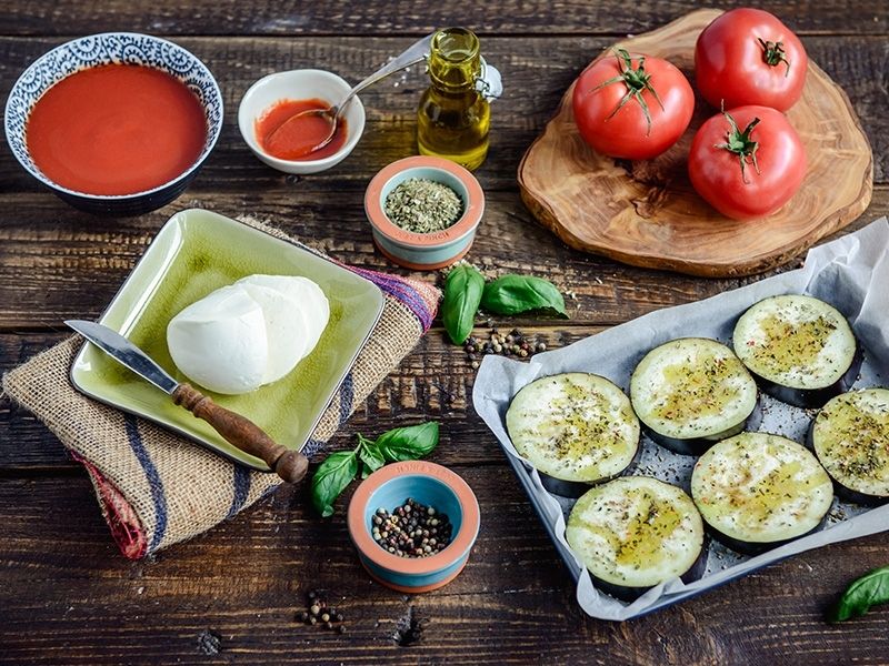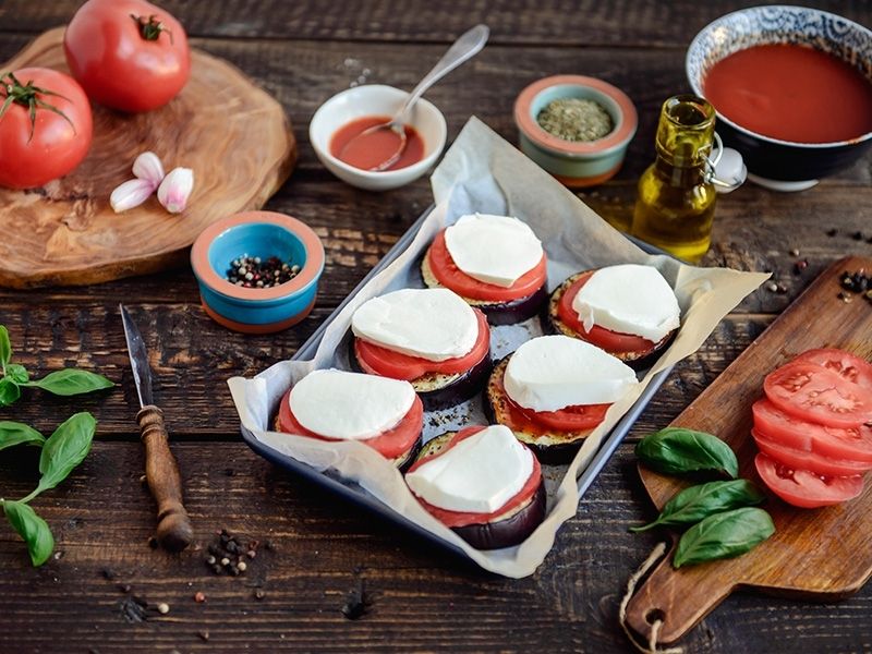 Piekarnik nagrzewamy do 180 C. Bakłażana kroimy na 2 cm krążki. Nacieramy ząbkiem czosnku, posypujemy solą, pieprzem, suszonym oregano i polewamy oliwą z oliwek. Wkładamy na 10 min do piekarnika. W międzyczasie podgrzewamy sos pomidorowy. Kroimy pomidora i mozzarellę na plasterki. Na każdy plaster bakłażana nakładamy łyżkę ciepłego sosu, plaster pomidora, plaster mozzarelli.