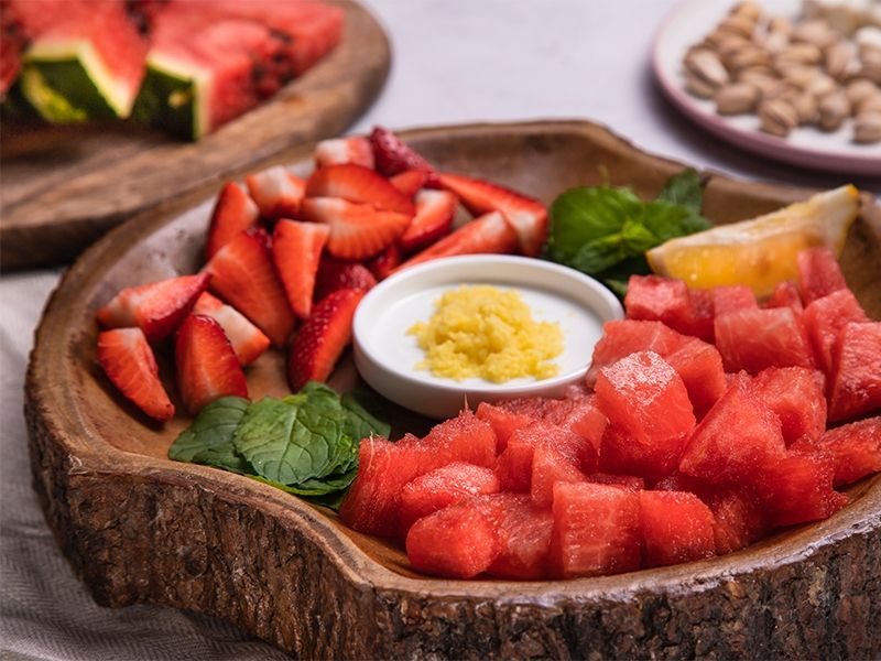 Arbuza kroimy na mniejsze kawałki i usuwamy pestki. Imbir trzemy na tarce. Z truskawek usuwamy szypułki. Arbuz, truskawki, imbir i garść mięty umieszczamy w naczyniu i blendujemy. Powstałą masę odstawiamy do lodówki na pół godziny.