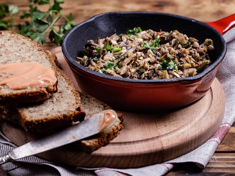 Pieczarki bardzo drobno siekamy. Na patelni rumienimy wcześniej drobno posiekany czosnek oraz cebulę. Wrzucamy pieczarki, doprawiamy estragonem, solą i pieprzem. Całość smażymy do odparowania wody z pieczarek (zmniejszą swoją objętość o połowę). Na koniec dodajemy posiekaną pietruszkę. Majonez łączymy z ketchupem.