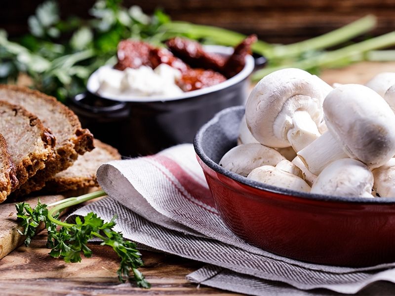Piekarnik wstawiamy na 1800C. Kromki smarujemy sosem, nakładamy na nie dość grubo pieczarki. Pomidory suszone kroimy na mniejsze kawałki i układamy na pieczarkach. Posypujemy startym serem mozarella. Pieczemy około 20 minut. Możemy je podać ze szczypiorkiem, świeżą pietruszką lub ulubionymi ziołami.