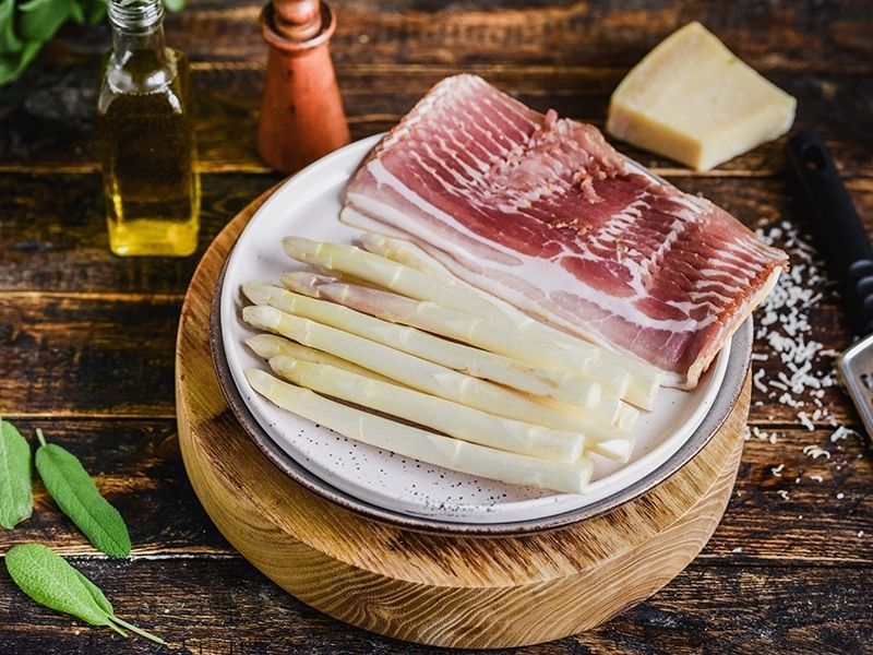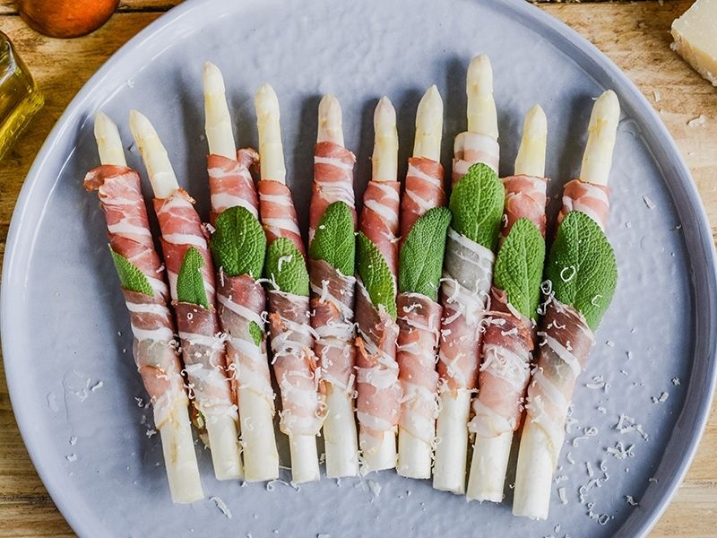 Szparagi myjemy, odrywamy zdrewniałe końce i układamy na talerzu. Każdego szparaga otaczamy plasterkiem cienko pokrojonego boczku, zawijając w nim listek szałwii. Czynność powtarzamy, aż do wyczerpania składników.