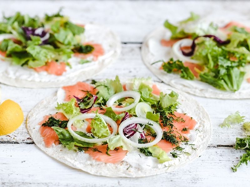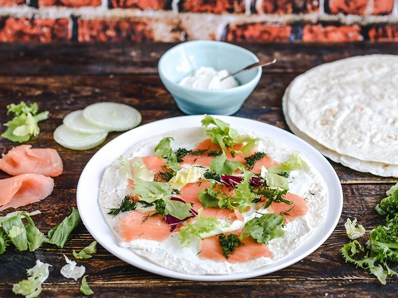 Tortille smarujemy kremowym serkiem. Na wierzchu układamy wędzonego łososia. Posypujemy pokrojona na plasterki cebulą, mixem sałat oraz posiekanym koperkiem. Następnie skrapiamy sokiem z cytryny.