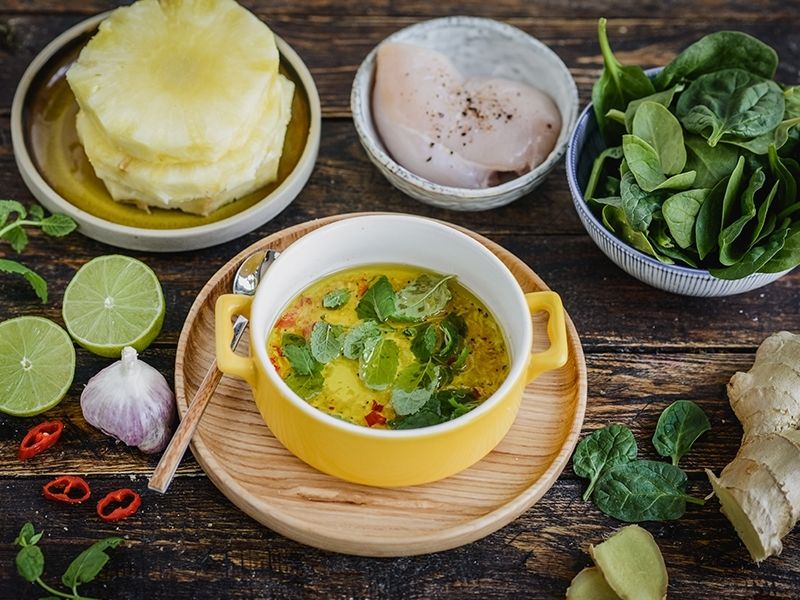 Do naczynia z sosem wkładamy umyte liście szpinaku oraz sałatę. Całość obtaczamy. Dodajemy pokrojony na mniejsze kawałki seler naciowy. Następnie pokrojony na kawałku ugrillowany ananas oraz pokrojoną w plastry pierś z kurczaka. Doprawiamy na koniec świeżo zmielonym pieprzem oraz posypujemy ziarenkami czarnego sezamu.