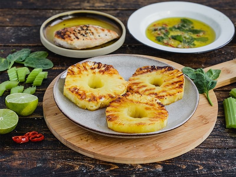 Pierś z kurczaka myjemy i oprószamy solą oraz pieprzem. Skrapiamy sokiem z cytryny i grillujemy na patelni grillowej ok 3-4 min z każdej strony. Plastry ananasa posypujemy cukrem i grillujemy do zarumienienia z każdej strony.