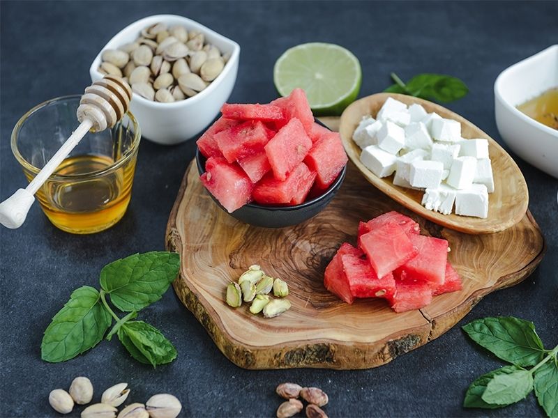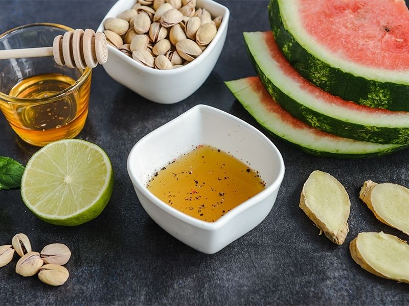 Aby przyrządzić sos, miód mieszamy z sokiem z limonki, startym drobno imbirem oraz pieprzem. Arbuza kroimy na kawałki i układamy je w misce.