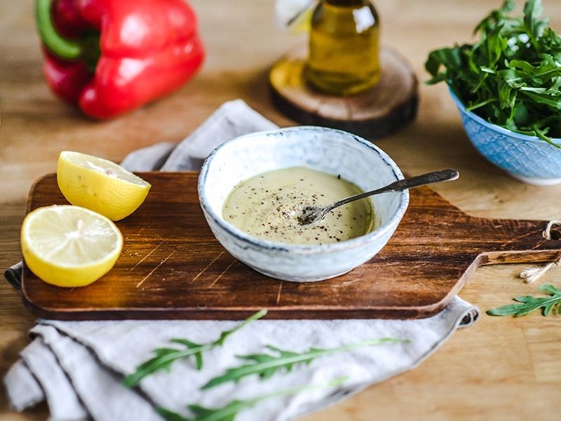W małej misce mieszamy musztardę z sokiem z cytryny. Następnie dodajemy oliwę z oliwek i mieszamy do połączenia się składników. Doprawiamy solą oraz pieprzem. Piekarnik nagrzewamy do 180C. Papryki układamy na blaszce wyłożonej papierem do pieczenia. Wkładamy do piekarnika na 10 -15 min.