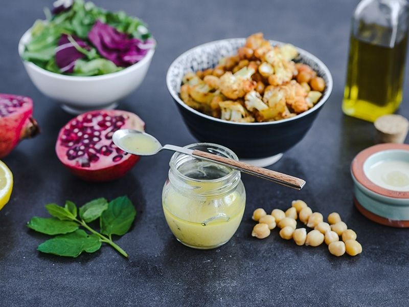 Na talerzu układamy mix sałat, dodajemy pieczone warzywa, pestki granatu oraz listki świeżej mięty. Całość skrapiamy sosem tahini. Przygotowujemy sos: do oliwy dodajemy pastę tahini, sok z cytryny i łyżkę miodu. Doprawiamy solą oraz pieprzem i energicznie mieszamy. Polewamy sosem sałatkę.