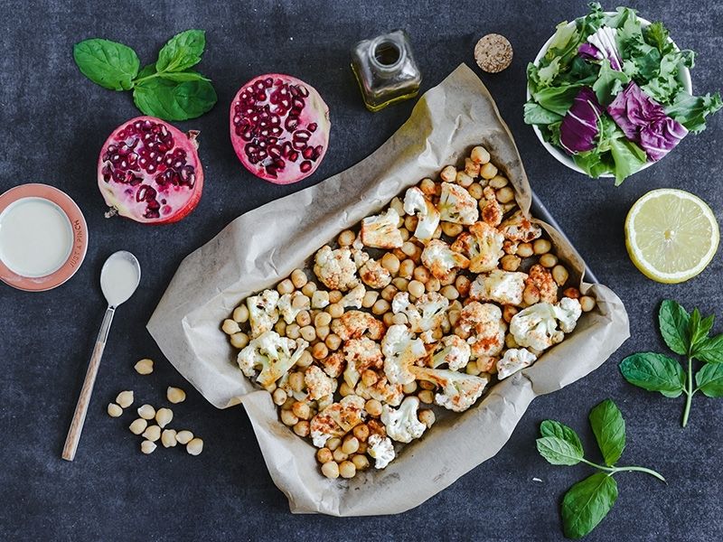 Piekarnik nagrzewamy do 200 C. Blachę wykładamy papierem do pieczenia. Kalafior kroimy w drobną kostkę i wykładamy wraz z ugotowaną ciecierzycą na blachę. Całość posypujemy przyprawami, polewamy oliwą z oliwek oraz sosem sojowym. Pieczemy 25 min., w międzyczasie kilka razy mieszając.