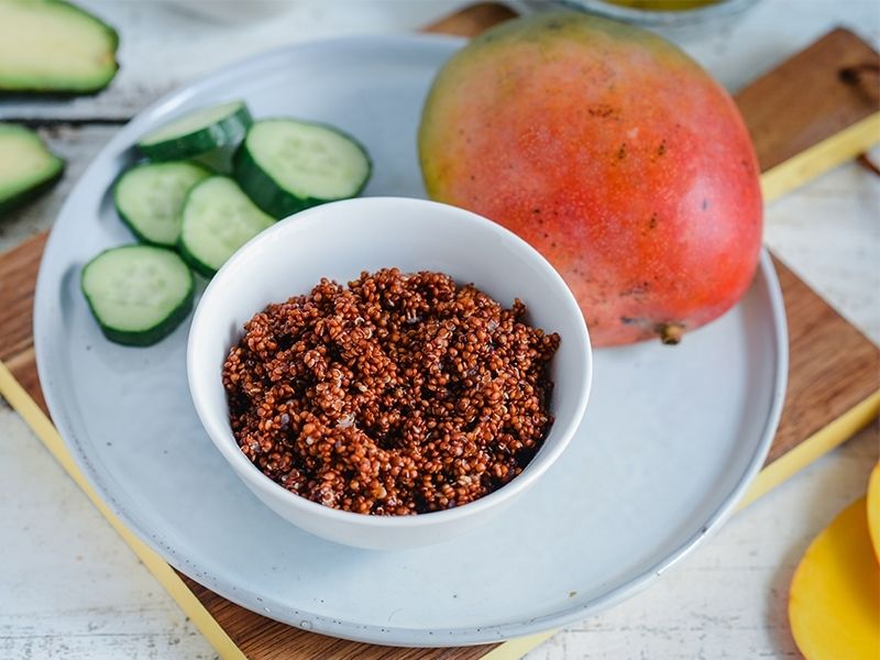 Komosę płuczemy, zalewamy 100 ml wody i dodajemy szczyptę soli. Gotujemy przez 10 min. Następnie zdejmujemy ją z ognia i trzymamy pod przykryciem 2-3 min. W międzyczasie na talerzu układamy mieszankę sałat, posiekane w paski mango oraz awokado. Dodajemy plasterki ogórka.
