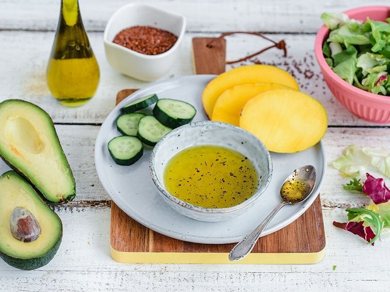 Tak ułożone składniki sałatki posypujemy ugotowaną komosą ryżową. Przygotowujemy sos: w miseczce mieszamy oliwę z octem jabłkowym oraz miodem. Doprawiamy solą i pieprzem. Powstałym sosem polewamy sałatkę tuż przed podaniem.