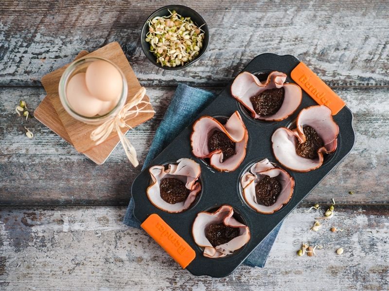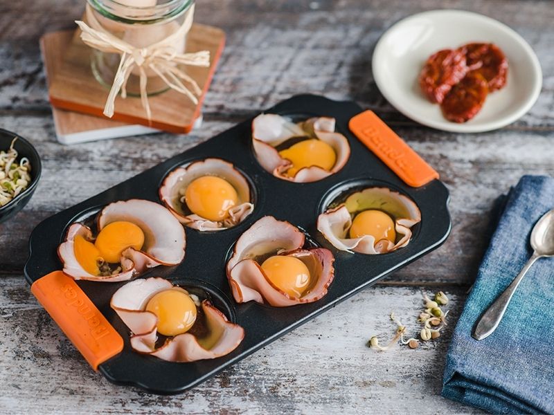 Do każdego wgłębienia włożyć plasterek szynki, a potem suszony pomidor. Następnie wbić po jednym jajku.