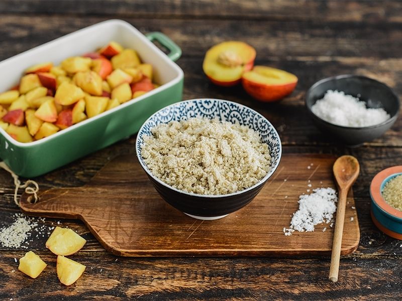 Kruszonką posypujemy nektarynki i wstawiamy do piekarnika na 25-30 min., aż wierzch nieco się zrumieni. W międzyczasie mleko kokosowe podgrzewamy w rondelku z łyżką cukru, aż zgęstnieje i powstanie kremowy sos. Polewamy nim nektarynki przed podaniem.