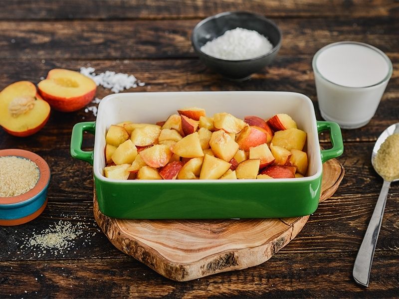 „Oto deser, który skruszy opór nawet osób będących na diecie. Owoce, mąka orkiszowa i mleko kokosowe – takiej kompozycji nie sposób się oprzeć!”