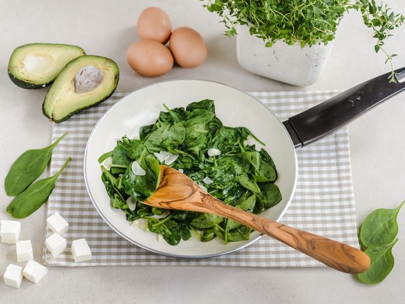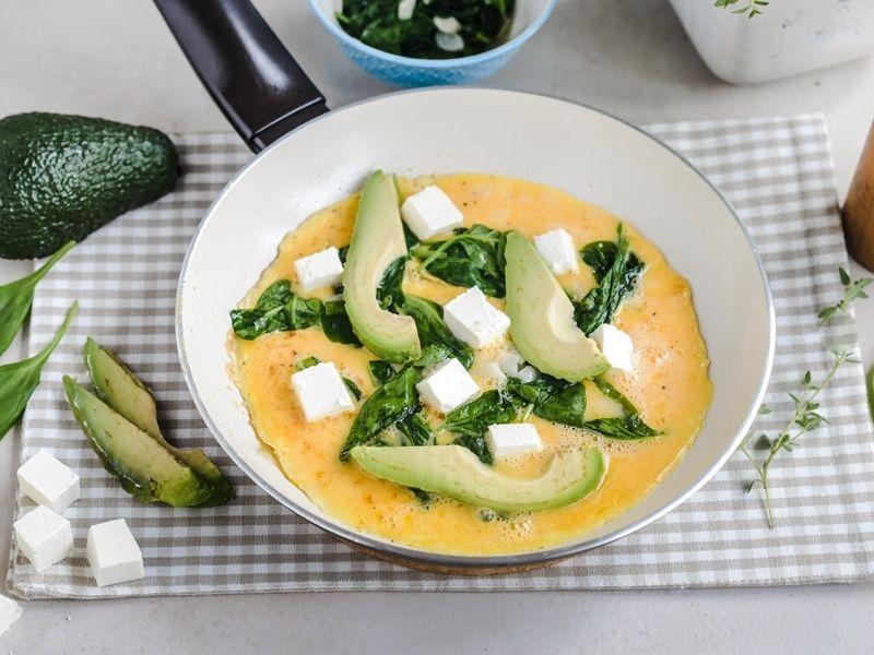 Jajka roztrzepujemy widelcem z dodatkiem mleka oraz szczyptą soli i pieprzu. Na patelni roztapiamy łyżeczkę masła i smażymy jajka przez 2 min pod przykryciem. Układamy na wierzchu szpinak, pokrojoną w kostkę fetę, awokado i listki bazylii. Zostawiamy pod przykryciem na 2-3 min. Możemy przełożyć na pół, aby masa szybciej się ścięła.
