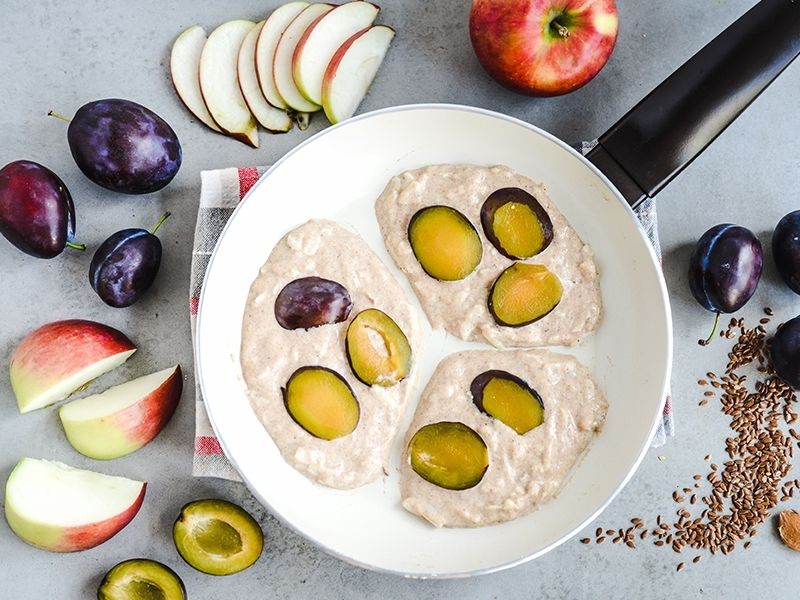 Rozgrzewamy patelnię. Nakładamy porcję ciasta. W masę wkładamy po kilka plasterków śliwek. Placuszki smażymy 2-3 min. z każdej strony. Czynność powtarzamy do wyczerpania składników. Podajemy udekorowane plasterkami śliwek i polane miodem.
