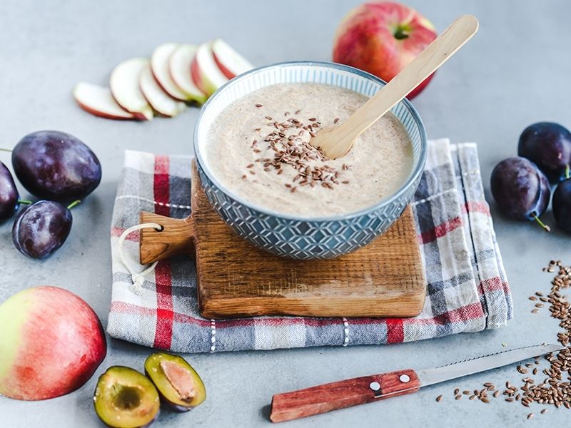 Do miski wlewamy jogurt, dodajemy jajka, olej roślinny i mieszamy, aż powstanie gładka masa. Następnie dodajemy mąkę, proszek do pieczenia, siemię lniane, cynamon i cukier. Delikatnie mieszamy do połączenia się składników. Na końcu dodajemy jabłko starte na grubych oczkach. Śliwki kroimy na plasterki (zostawiamy kilka do dekoracji).
