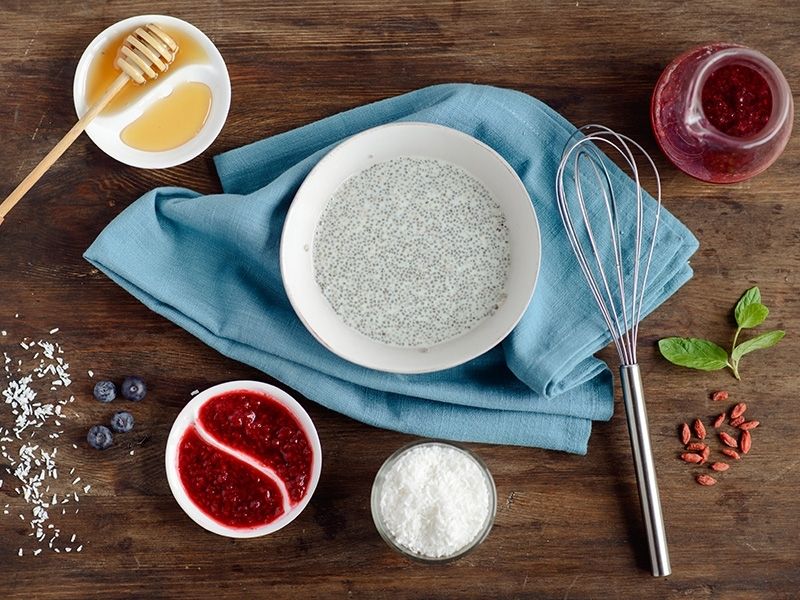 Nasiona chia wrzucamy do miski. Dodajemy mleko sojowe oraz miód. Całość mieszamy energicznie trzepaczką ok. 2 min. Przelewamy do dwóch słoików lub pucharków i odstawiamy do lodówki na kilka godzin lub na całą noc.