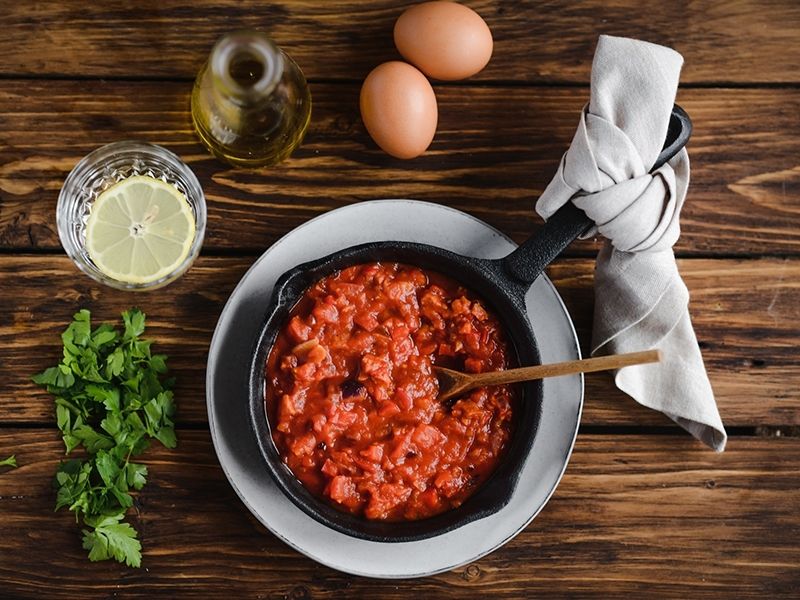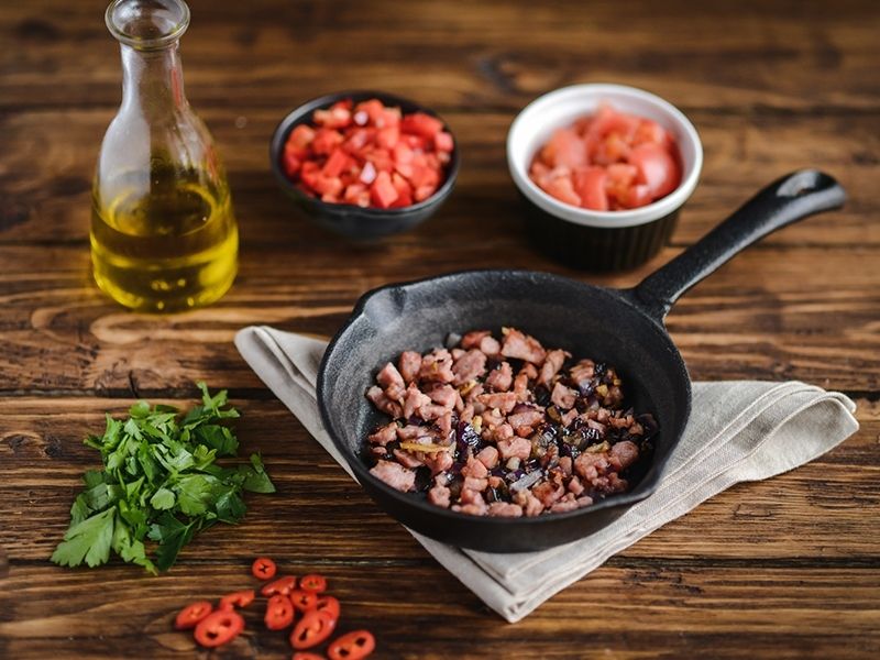Obrać pomidory ze skórki i pokroić na kosteczkę. Dodać do zawartości patelni. Całość gotować pod przykryciem na małym ogniu ok. 30 min.