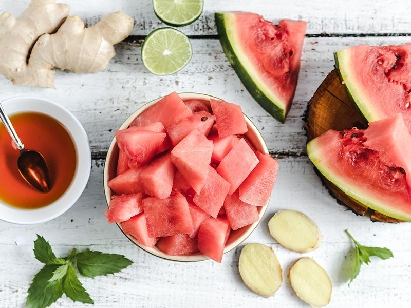 Cukier rozpuszczamy w gotującej się wodzie. Odstawiamy do wystudzenia. Arbuza kroimy w kostkę i usuwamy pestki. Wkładamy do miksera i blendujemy na gładki mus. Imbir obieramy ze skórki, trzemy na tarce na drobno i dodajemy do miąższu arbuza.